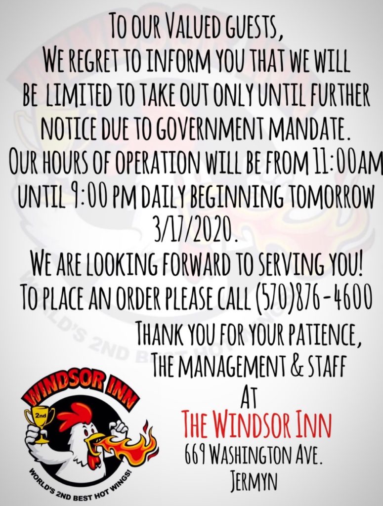 In 1978, Paul and Andy Whitiak founded the Windsor Inn and perfected the recipe and technique for the "Original Chickin' Pickin' Lickin' Wings". They were the first ever Hot Wings outside of New York state. The overwhelming response by loyal patrons signaled the beginning of the Windsor Hot Wing legacy. In 1985 it became official - Windsor Inn Hot Wings were named the "World’s 2nd Best Hot Wings"- second only to the original hot wings served at the Anchor Bar in Buffalo, NY since 1964. The popularity of our hot wings gave rise to wing contests called Wing-Offs throughout the region. The Windsor took one award after another, including the 1993 and 1994 WHPA Invitational State Championship, held in Altoona PA. In 1994, we shattered our own record, serving 12,000 Hot Wings to capture 45 percent of the vote! Local polls continue to vote the Windsor Inn the Best Hot Wings in Northeastern Pennsylvania! People travel from far and wide for a taste of Hot Wing history. We've been serving the most popular and talked-about Hot Wings south of Buffalo for over 40 years. We've served tens of millions of wings over the years! In June of 2016 the Windsor began a new chapter of its storied history. Andy and Sue Whitiak have entrusted us to carry on the Windsor Inn tradition. Our families grew up as fans of the Windsor and appreciate its history and significance within our community. It is our promise that we will maintain the high standards that the Windsor Inn has represented over the years. We will continue to serve the "World's 2nd best Hot Wings" to the "World's best patrons!"
